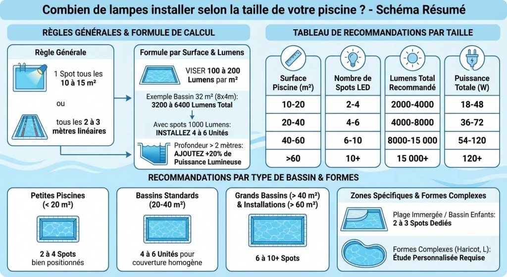 • Piscine standard de 20 à 40 m² (type 8×4 m) : 4 à 6 spots